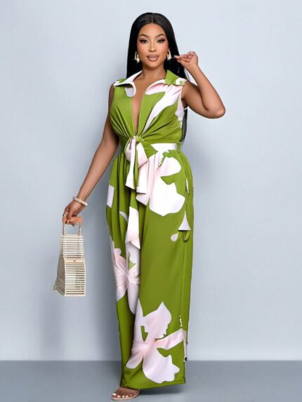 Women’s Sleeveless Halter Neck Tropical Leaf Print Chiffon Top & Shorts Jumpsuit Outfit