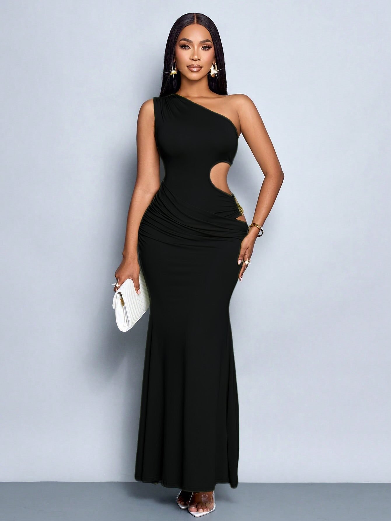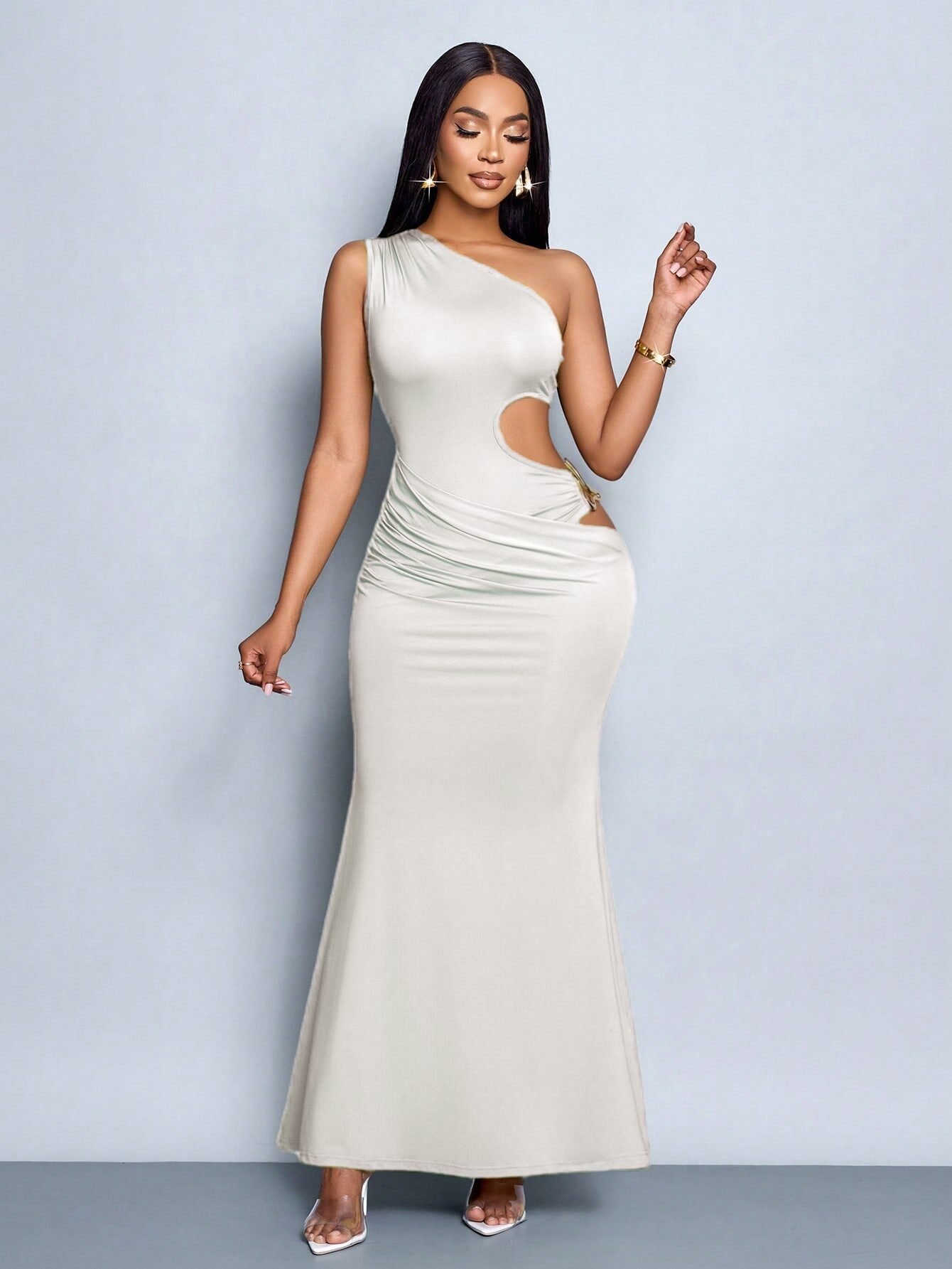 Women’S Sexy Solid One Shoulder Cut Out Waist Hollow Out Metal Decorated Bodycon Dress