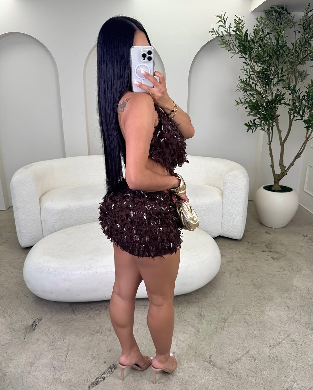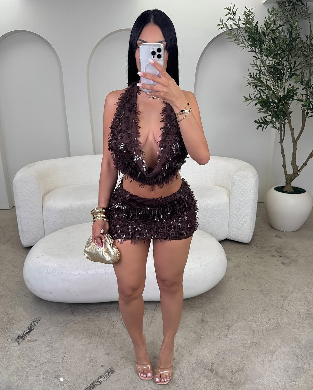 Be the first to review “Women’s Two-Piece Set, Autumn Fashion, Sequined Halter Deep V Backless New Split Outfit” Cancel reply